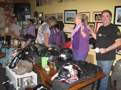 Todas as mesas foram ocupadas pelos vendedores de equipamentos motociclísticos e demais quincalharias.E também houve momentos em que a sede ficou cheia de compradores e curiosos. Mas sentiu-se que não circulou tanto graveto como nos anos anteriores. A tal famigerada crise? O facto de se fazer isto num dia 24 e não no início do mês? Certo é que se fizeram bons negócios e houve muita tralha a mudar de dono. Desde os inevitáveis capacetes, malas para motos, luvas e equipamentos até livros, jogos, roupas, piscinas e... fatos de mergulho. Notou-se também que os preços estavam muito mais baixos. Por tuta e meia se aliviava a mercadoria. Isto numa tarde em que recebemos o entusiasta brasileiro Sérgio Marinho do MC Livres Para Voar de Petrópolis, Rio de Janeiro.